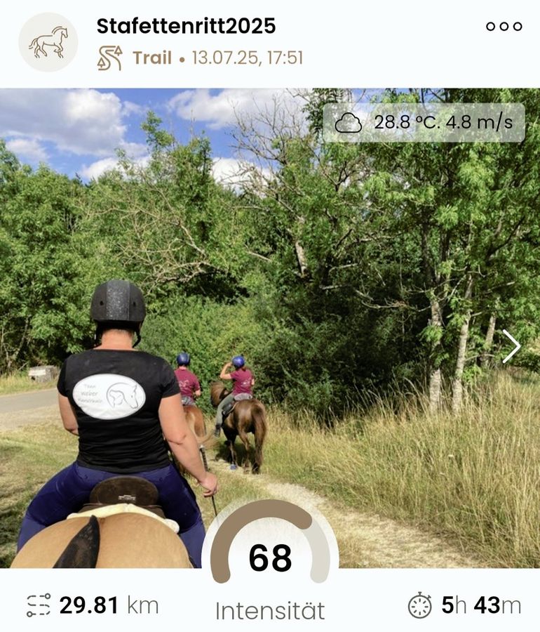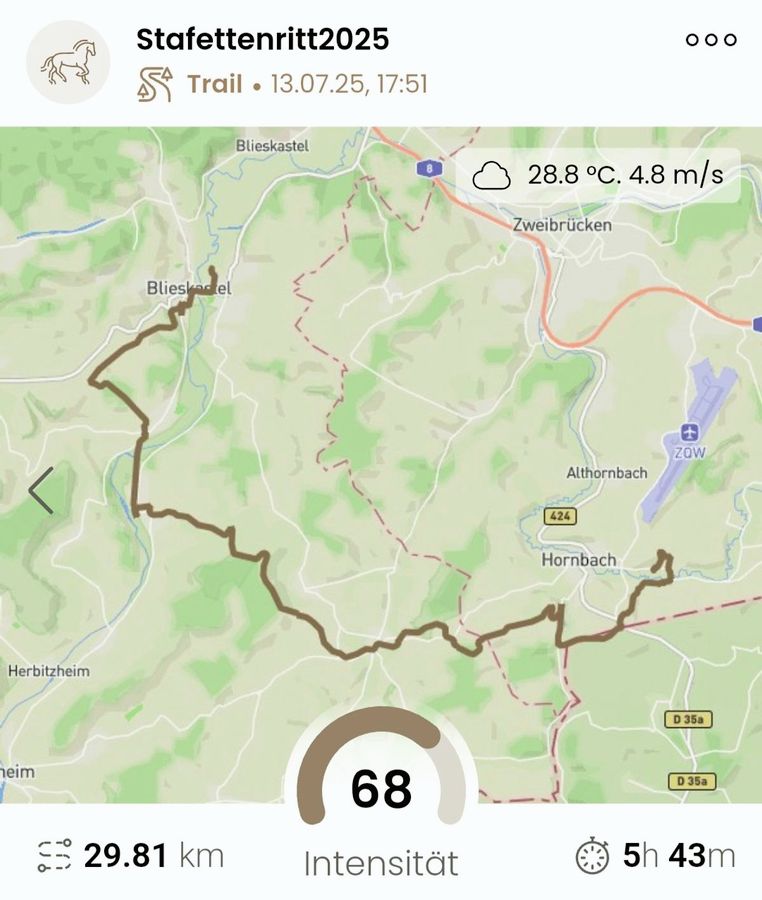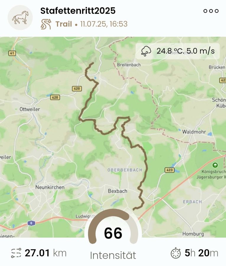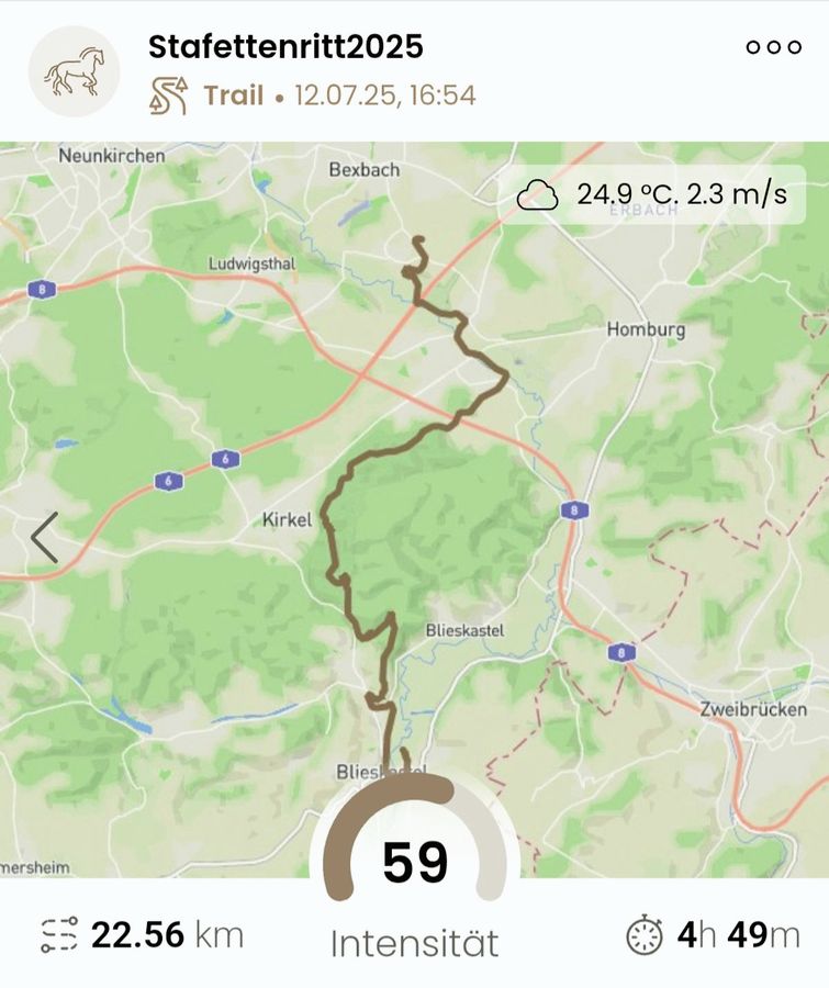 Am 11.07. (Tag 18) ging es von St. Wendel durch Wälder und eine offene Landschaft bis nach Niederbexbach. Insgesamt wurden 27,01 km in gut 5 Stunden geritten. Am Tag danach (Tag 19) wurden 22,56 km in knapp 5 Stunden nach Webenheim zurückgelegt. Die Route war abwechselungsreich und ging durch das Bliestal und den Kirkeler Wald. Die Etappe 20 führte nach Contwig. Dabei wurden 29,81 km in 5 Stunden 43 Minuten bewältigt.
