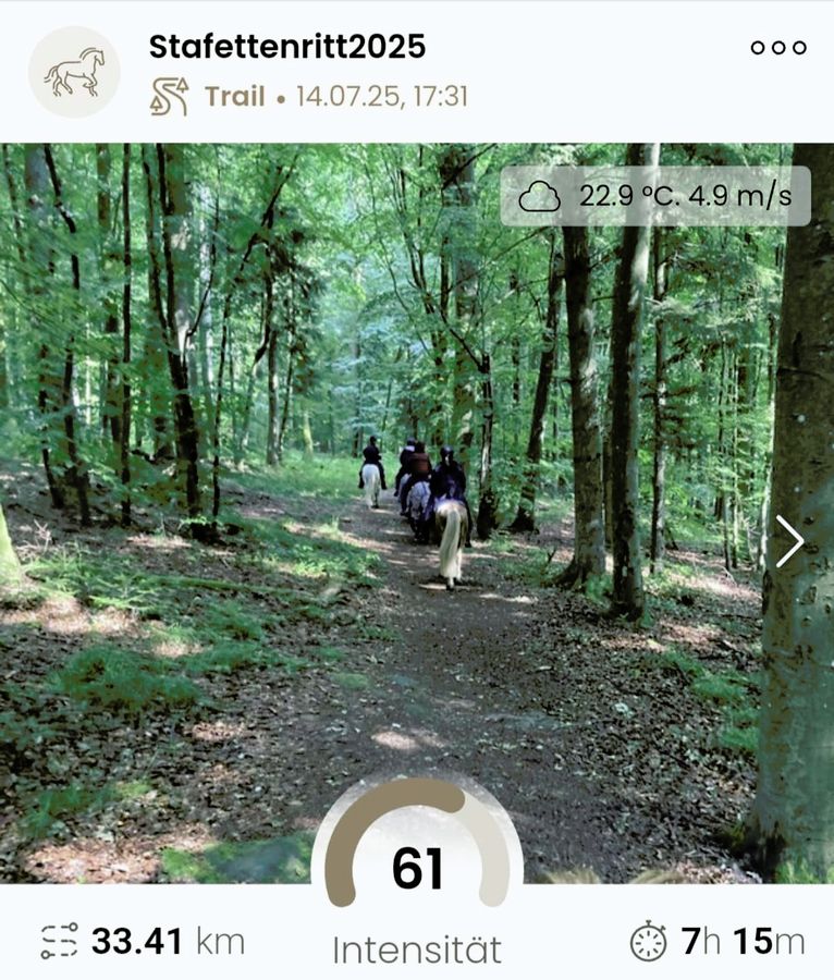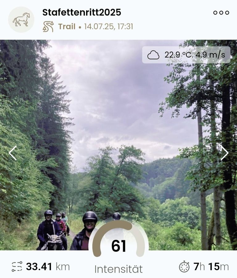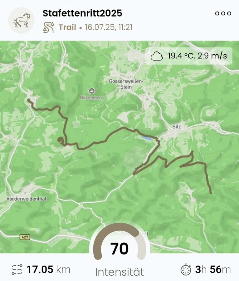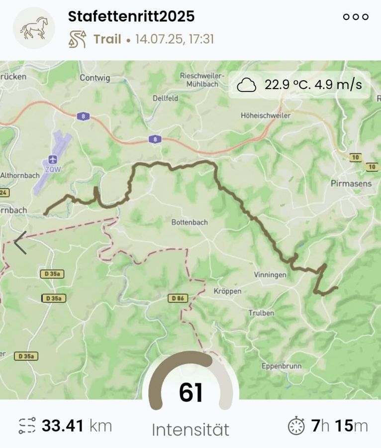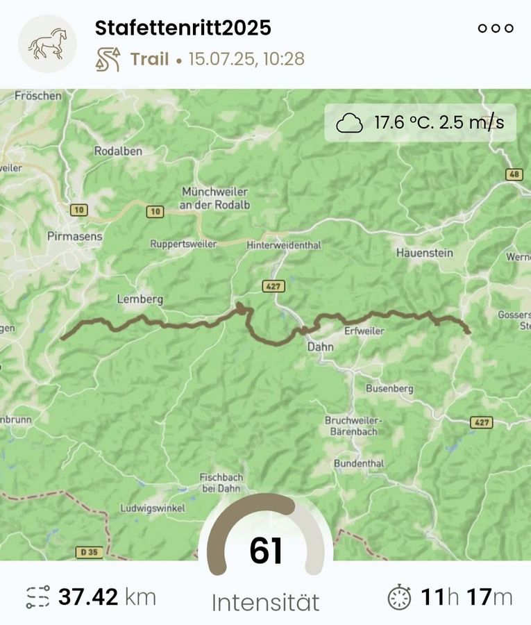 Am 14.07. (Tag 21) ging es von Contwig nach Lemberg durch Wald und offene Landschaft. Insgesamt wurden 33,41 km in gut 7 Stunden 15 Minuten geritten. Am Tag danach (Tag 22) wurden 37,42 km in 11 Stunden 17 Minuten nach Darstein zurückgelegt. Die Etappe 23 führte nach Bad Bergzabern. Dabei wurden 17,05 km in 3 Stunden 56 Minuten bewältigt.