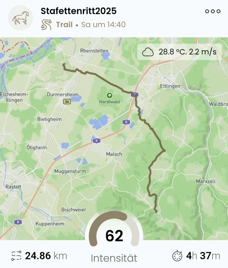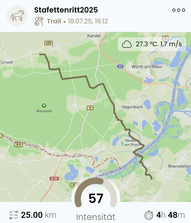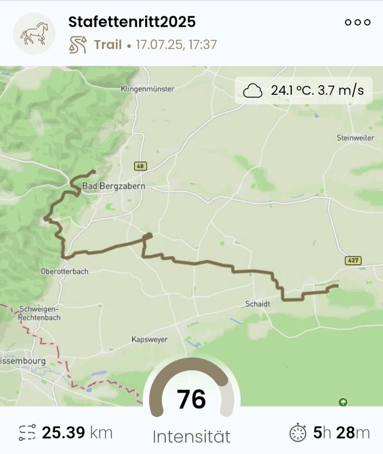 Am 17.07. (Tag 24) ging es von Bad Bergzabern vom Pfälzerwald durch Wälder in die Rheinebene. Insgesamt wurden 25,39 km in 5 Stunden 28 Minuten geritten. Am Tag danach (Tag 25) wurden 25 km in 4 Stunden 48 Minuten nach Rheinstetten zurückgelegt. Die Etappe 26 führte nach Marxzell. Dabei wurden 24,86 km in 4 Stunden 37 Minuten bewältigt.