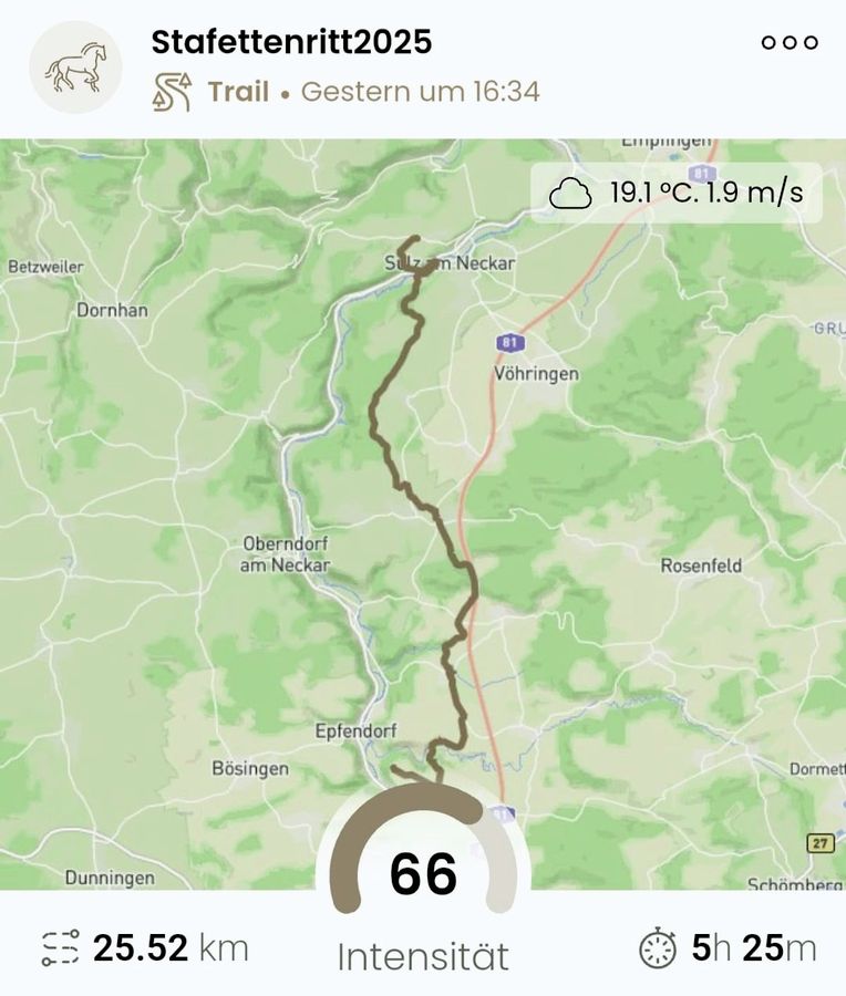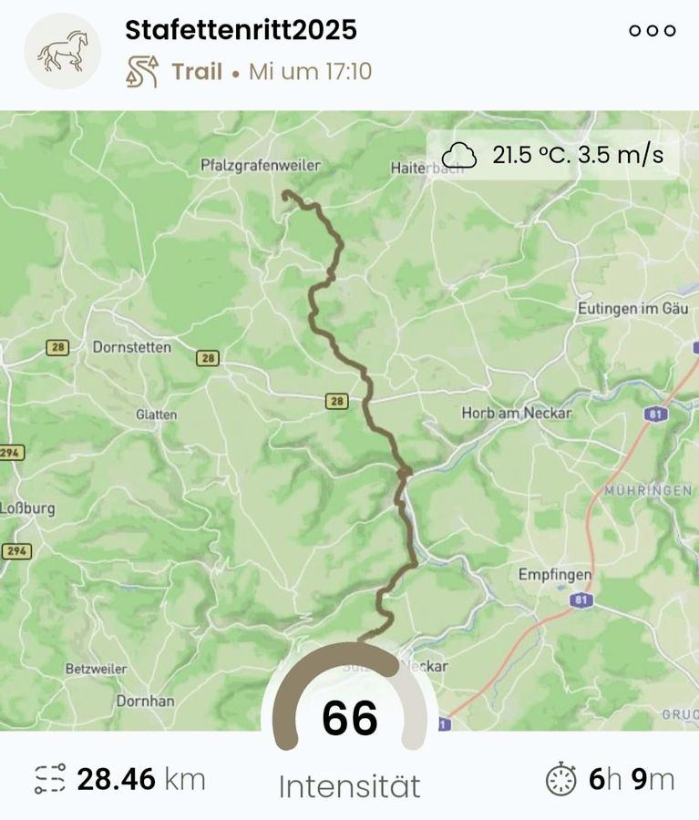 Am 23.07. (Tag 30) ging es von Pfalzgrafenweiler nach Sulz a. Neckar. Insgesamt wurden 28,46 km in gut 6 Stunden geritten. Am Tag danach (Tag 31) wurden 25,52 km in 5 Stunden 25 Minuten nach Epfendorf zurückgelegt.