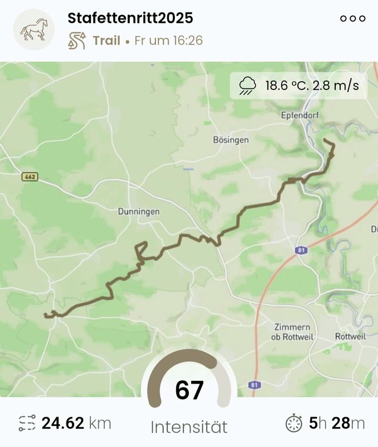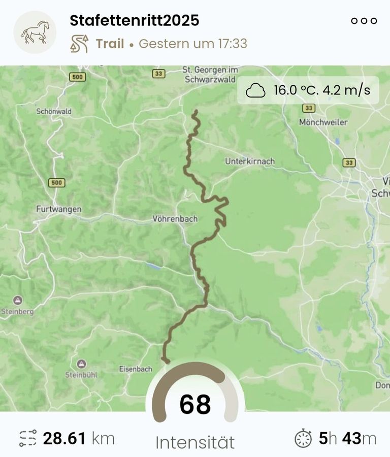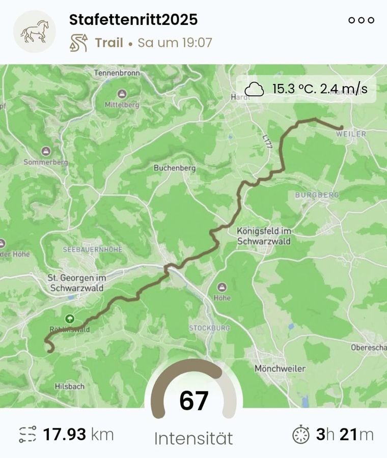 Am 25.07. (Tag 32) ging es von Epfendorf nach Weiler Köngisfeld. Insgesamt wurden 24,62km in gut 5 Stunden und 30 Minuten geritten. Am Tag danach (Tag 33) wurden 17,93km in 3 Stunden und 21 Minuten nach St. Georgen zurückgelegt. Am Sonntag ging es dann über bergiges Land nach Eisenbach. Der Ritt dauerte gut 5 Stunden und 43 Minuten und belief sich auf insgesamt 28,61 Kilometer.