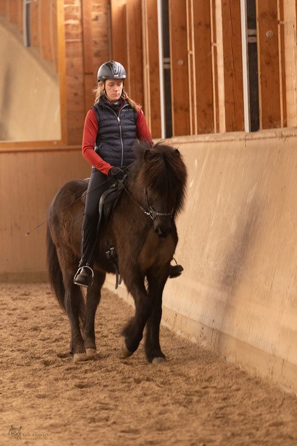 Eigentlich ist das Reiten von Dressurlektionen nicht das, was das Islandpferd ausmacht. Wind in der Mähne, Feuer im Auge — das ist es, warum das Islandpferd begeistert. Seine Ursprünglichkeit, seine Freiheit. Das soll sich auch in seinen Bewegungen unter dem Reiter widerspiegeln. Seien wir also ehrlich: Dressurlektionen zu pauken ist nicht seine Passion. Doch dass das Erarbeiten und maßvolle Integrieren von Schulterherein und Co das Islandpferd durchaus in seiner Vielfalt und in der Bewegungsqualität fördern kann, zeigte die Trainerfortbildung auf dem Gestüt Falkenegg unter der Leitung von IPZV Ausbilderin Rosl Rößner.