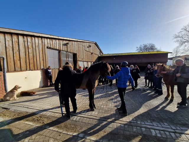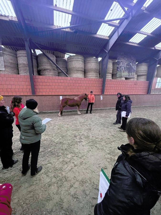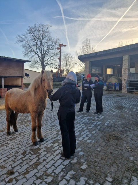 Jeder Kurs wurde mit einer Prüfung, in der die Kursinhalte abgefragt wurden, beendet. In den ersten drei Kursen erfolgte dies durch einen kurzen schriftlichen Theorie-Check. In Kurs 4 gab es eine praktische Prüfung: Beschreibung und Einschätzung eines Pferdes in Bezug auf sein Gebäude, sein Interieur und seine Gangqualität. Und als sinnvolle Ergänzung kam noch das Vorstellen der Prüfungspferde analog einer Jungpferdematerialprüfung in Dreierteams hinzu.